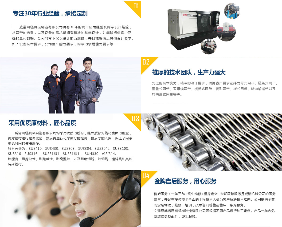 我們是具有20多年設計和生產標準輸送網帶和制定輸送網帶標準的有活力的中國公司。 我們向很多行業的原始設備制造商和終端客戶提供網帶,這些行業包括:烘焙、油炸、冷卻、烤爐、速凍機、熱處理、玻璃器皿、電子元件、粉末冶金、鑄造、......